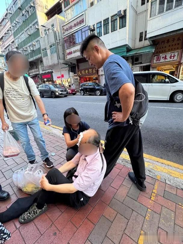最近有网友在社交平台晒出一张感人街头照片。在照片画面中,一位年长伯伯跌坐街头、头部受伤,一位好心女士正在帮他止血,而TVB绿叶演员杨证桦则坐在后方,伸出一只脚让伯伯靠着,伯伯一手按着头,看似在等待救护车到场。